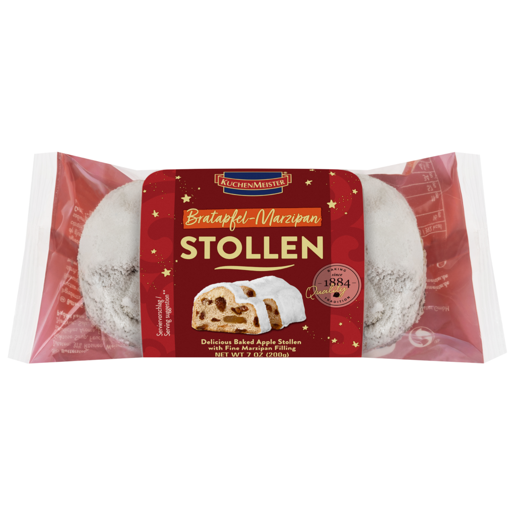 KuchenMeister’s baked apple stollen is the perfect blend of Christmas flavors. The fruity baked apple filling is refined with apple pieces and cinnamon. Baked according to our traditional recipe and dusted with decorative powder.