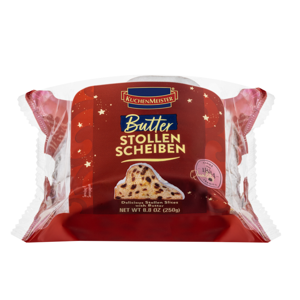 KuchenMeister’s butter stollen are baked according to a traditional recipe and refined with real butter, which makes our stollen particularly moist. Raisins and candied fruit add a fruity, festive note. Individually packaged, they are perfect for eating on the go.