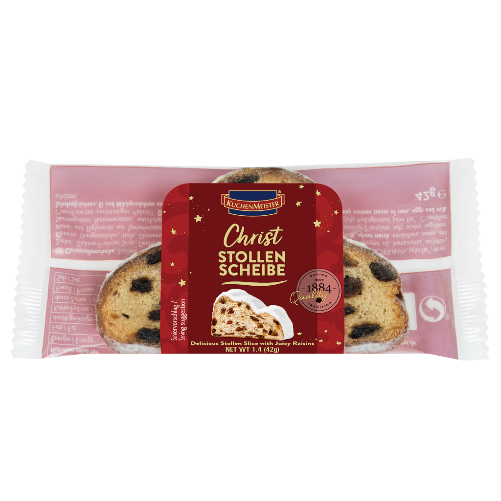 KuchenMeister’s Christmas stollen is a specialty of the house and has been baked according to a traditional recipe for generations. Popular in this classic style, it is filled with raisins and candied fruit.