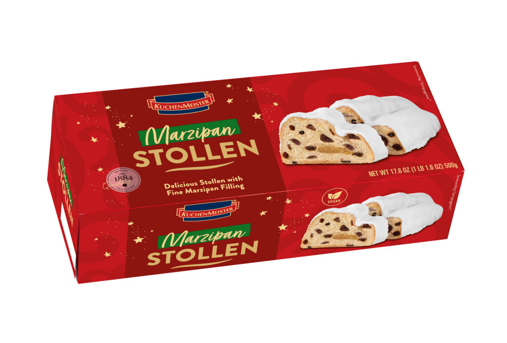 KuchenMeister’s fine marzipan stollen Baked according to a traditional pastry chef’s recipe, it is filled with moist marzipan. Raisins and candied fruit round off its classic stollen flavor. A pure delight for Christmas.