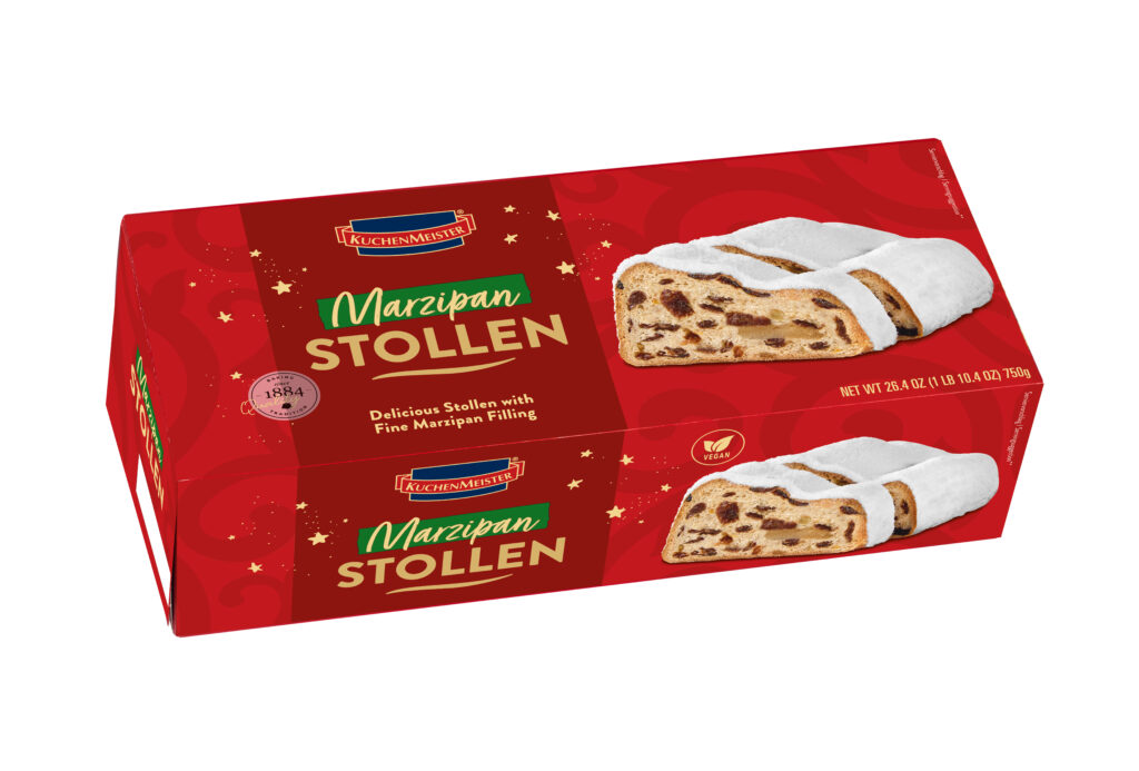 KuchenMeister’s fine marzipan stollen Baked according to a traditional pastry chef’s recipe, it is filled with moist marzipan. Raisins and candied fruit round off its classic stollen flavor. A pure delight for Christmas.