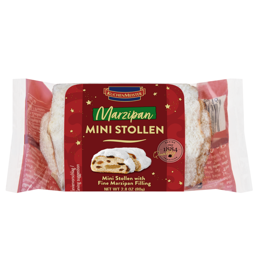 KuchenMeister’s fine marzipan stollen Baked according to a traditional pastry chef’s recipe, it is filled with moist marzipan. Raisins and candied fruit round off its classic stollen flavor. A pure delight for Christmas.