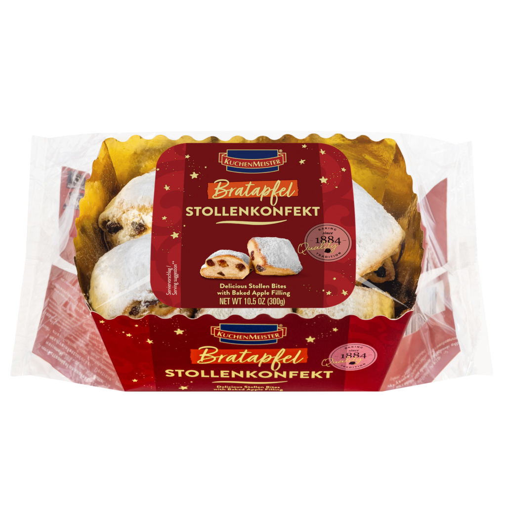 A wonderful winter pastry in a convenient snack size: the stollen dough is refined with a fruity baked apple filling with apple pieces, aromatic cinnamon, and hazelnut brittle. Raisins complement the sweet, fruity flavor.